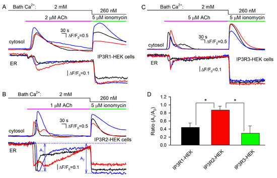 To extend the experimental capability of the engineered lines, R-CEPIA1er, the Ca2+sensor with a reticular location [40], was heterologously expressed in IP3R1-, IP3R2-, and IP3R3-HEK cells. Being loaded with Fluo-8, R-CEPIA1er-positive cells allowed for simultaneous monitoring of cytosolic and reticular Ca2+ (Figure 6). ACh stimulated Ca2+ transients in the cell cytosol (Figure 5A–C, upper panels) and a synchronous drop in reticular Ca2+, which relaxed close to the resting level despite the agonist still being present in the bath (Figure 6A–C, bottom panels). The Ca2+ ionophore ionomycin (5 μM) applied at low bath Ca2+ (260 nM) also triggered cytosolic Ca2+ signals (Figure 6A–C), presumably by penetrating through plasmalemma and increasing Ca2+ permeability of the reticular membrane. In this case, the low steady-state level of the ionomycin response was achievable if Ca2+ fluxes mediated by SERCA and ionomycin were precisely balanced. The relative effects of the agonist and ionophore on reticular Ca2+ were quantified by the A1/A2 ratio, where magnitudes of Ca2+ signals elicited by ACh (A1) and ionomycin (A2) were determined as indicated in Figure 6B. As summarized in Figure 6D, ionomycin emptied Ca2+ store in IP3R1- and IP3R3-HEK cells to a much higher extent than ACh did (Figure 6A,C, bottom panels). In contrast, ACh and ionomycin dropped luminal Ca2+ in IP3R2-HEK cells to comparable levels (Figure 6B, bottom panels).