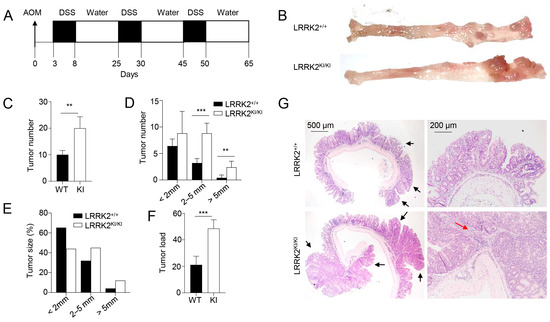 LRRK2 G2019S promotes the pathogenesis of colitis-associated colon cancer. (A) Schematic diagram for AOM/DSS-induced inflammatory carcinogenesis. We administered 8–12-week-old mice with AOM at a dose of 10 mg/kg mouse by intraperitoneal (IP) injection. Three days later, mice were given 2.5% DSS for 5 days, and then mice were rested for 16 days. This process was repeated for another two cycles starting on day 25 and day 45, respectively. Mice were euthanized on day 65 for analysis, as stated below. (B) Representative image of gross colons from LRRK2+/+ and LRRK2KI/KI mice. (C) Tumor numbers in colons of LRRK2+/+ (WT) and LRRK2KI/KI (KI) mice. (D) Tumor size distributions in colons of LRRK2+/+ and LRRK2KI/KI mice. (E) Tumor size percentage in colons of LRRK2+/+ and LRRK2KI/KI mice. (F) Average tumor load was determined by summing all tumor diameters for a given animal. (G) H&E staining of tumor sections from colons of LRRK2+/+ and LRRK2KI/KI mice. Black arrows point to the tumors. The red arrow points to tumor cells invading the lamina propria. p-values were determined by Student’s t test, with n = 5 mice/group in each experiment. Data represent the mean ± SD. *** p < 0.01 and *** p < 0.001. Data are from one representative experiment out of three independent experiments.