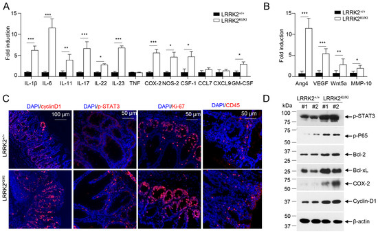 IL-1β has been shown to play an important role in CAC development via activating NF-κB [54]. IL-6, a well-established cytokine induced by IL-1β in intestinal epithelial cells (IECs) [55], has been shown to promote tumor progression in CAC through the activation of the oncogene STAT3 [56] in addition to IL-11 [57]. Consistent with these, we observed increased staining of phosphorylated STAT3 in the colon IECs of LRRK2 KI mice (Figure 2C). The activation of STAT3 or NF-κB upon AOM/DSS induction was expected to promote proliferation and survival of IECs, and then we tested the proliferation markers in the colon epithelium of LRRK2 KI and WT mice. Cyclin D1, which is a target gene of both STAT3 and NF-κB and critical for cell proliferation and survival, was highly expressed in the epithelium of LRRK2 KI mice compared to WT mice. The Ki-67 protein has been widely used as a proliferation marker for tumor cells. Consistently, we detected a higher number of Ki-67-positive cells in the colon epithelium of LRRK2 KI mice compared to WT controls (Figure 2C). In addition, we observed increased CD45+ leukocyte infiltration in the tumor tissue in the LRRK2 KI mice (Figure 2C). Consistent with gene expression analysis and immunohistochemical staining, immunoblot analysis revealed that p-STAT3, p-P65, Bcl-2, Bcl-xL and cyclin D1 levels in tumor tissues from KI mice were dramatically increased. Cox-2 is important to produce prostaglandin E2 (PGE2) during inflammation. Of note, PGE2, which is the most abundant prostanoid in colorectal cancer, promotes anti-tumor immune responses by inducing Treg and MDSCs [30] and promotes tumor initiation and growth by upregulating the expression of DNMT1 and DNMT3B [58]. The immunoblot assay suggested an increased level of COX-2 in the tumor tissues from LRRK2 KI mice (Figure 2D). Taken together, these results demonstrate that the activation of IL-1β-NF-κB and IL-6/IL-11-STAT3 pathways may potentially play pivotal roles in the promotion of tumorigenesis in the colons of LRRK2 KI mice.