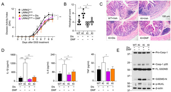 GSDMD inhibitors ameliorated the severity of DSS-induced colitis in LRRK2 KI mice. Acute colitis was induced in LRRK2+/+ (WT) and LRRK2KI/KI (KI) mice with 2.5% DSS in drinking water for 7 days, and mice were euthanized on day 9. Two groups of LRRK2KI/KI (KI) mice were treated with GSDMD inhibitors once a day during the DSS induction process. Disulfiram (Dis) was administered at a dose of 50 mg/kg by i.p. injection while dimethyl fumarate (DMF) was administered by oral gavage at 50 mg/kg. Colitis severity was shown by the following: (A) Disease activity index. (B,C) H&E staining of colonic tissue and histological score. (D) IL-1β, IL-6 and TNF levels in colon explant culture (100 mg colon tissue/mL medium) analyzed by ELISA. (E) Immunoblot analysis of proteins in the colon epithelial cells as indicated. – means not added, + means added. Two-way ANOVA was used to determine p-values in panel A and Student’s t-test in other related panels. n = 5/group. Data represent mean ± SD. * p < 0.05, ** p < 0.01 and *** p < 0.001. Data are from one representative experiment out of two independent experiments.