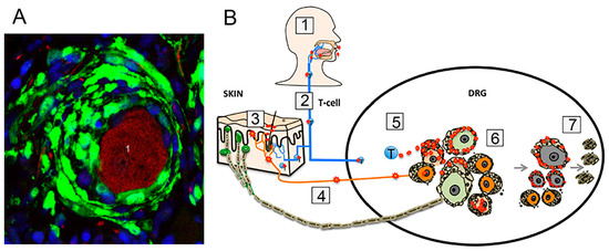 SGCs in VZV infection. (A) Micrograph of a neuron (1) labeled red for RT97 (mechanoreceptor marker) surrounded by abnormal onion-like layers of SGCs (labeled green for the VZV protein IE63). (B) Diagram depicting two possible modes by which sensory neurons can be infected by VZV. (1) Primary VZV infection is initiated in respiratory epithelial cells, followed by transfer to T cells in lymphoid tissue. The virus is represented as red dots. (2) Infected T cells enter the circulation. (3) T cells carry the virus to the skin. (4) From the skin, T cells reach DRG neurons by retrograde axonal transport. (5) The T cells also reach the DRG directly. Both pathways promote infection of DRG cells. (6) VZV gains access to both nociceptive (small, orange) and mechanoreceptive (large, green) neuronal somata by either route. Replication occurs only in nociceptive neurons. If replication in neurons is uncontrolled, infection of SGC facilitates spread to neighboring neuron–SGC units. (7) Over time, VZV infection in SGC contributes to neuronal death, mostly of mechanoreceptors, which presumably are more dependent on SGCs support than nociceptors. This leads to the formation of nodules of Nageotte. Reprinted from Zerboni and Arvin [50] under Creative Commons Attribution (CC-BY) license from PLOS Pathog.