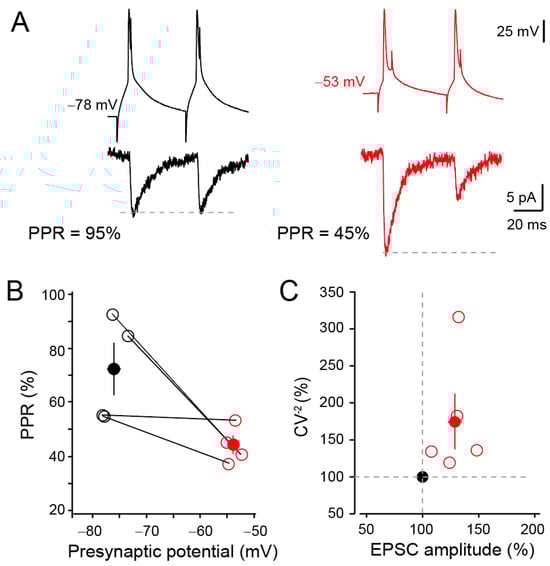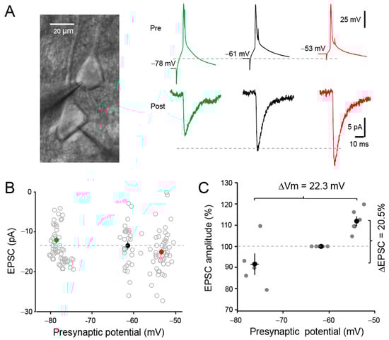 Pairs of connected L5 pyramidal neurons from the sensorimotor cortex of young rats were recorded in a whole-cell configuration. To induce depolarization-induced analogue–digital facilitation (d-ADF) and check the impact of the presynaptic membrane potential on the spike-evoked transmission, we changed the holding current from 0 to ±15–30 pA. Continuous presynaptic hyperpolarization from −61 to −78 mV reduced the amplitude of the spike-evoked EPSC, whereas continuous depolarization from −61 to −53 mV increased the EPSC amplitude (Figure 1A,B). On average, a shift in presynaptic membrane potential from −76.4 mV to −54.1 mV (i.e., corresponding to a ΔVm = 22.3 mV) induced an EPSC change from −91.4 to 111.9% (i.e., ΔEPSC = 20.5%; paired t-test, p < 0.05; Figure 1C), indicating that the facilitation index is ~1% per mV of presynaptic depolarization, as reported earlier [38,42]. We conclude that synaptic transmission is enhanced at synapses formed by pairs of L5-L5 neurons following slow changes in the membrane potential of the presynaptic neuron from hyperpolarization to depolarization.