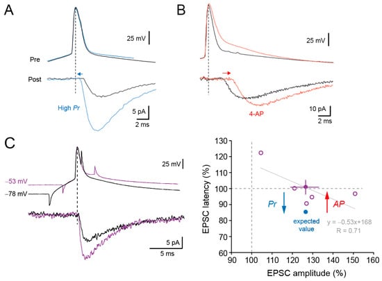 No change in synaptic delay during d-ADF. (A). A high release probability reduces the synaptic delay (taken from reference [26] with permission). The blue traces correspond to a high Pr whereas the black traces correspond to a low Pr. These data were recorded under spontaneous fluctuations in Pr. No change in the shape of the presynaptic AP is observed (see superimposed traces). (B). Action potential broadening induced by the application of 4-amino-pyridine (4-AP, red traces) delays synaptic latency (taken from reference [32] with permission). (C). Despite an elevation in Pr during d-ADF, EPSC latency is not changed. Left, representative traces at hyperpolarized presynaptic membrane potential (black traces) and at depolarized membrane potential (purple traces). Right, group data. Individual data correspond to open purple circles and the average to the filled purple circle. For an increase of +27% of EPSC amplitude, EPSC latency should be reduced by ~15% (expected value, blue disc). Yet, no change is observed on average (purple disc). The increase in synaptic delay induced by spike broadening due to the voltage inactivation of Kv1 channels is thought to compensate for the reduction in synaptic delay induced by elevated Pr. Grey line, linear regression of the data points with the corresponding equation.