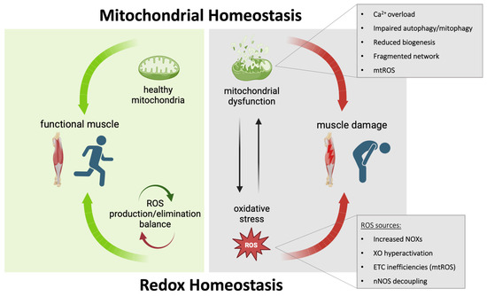 A functional muscle in healthy people is characterized by a proper balance of the redox system and mitochondrial homeostasis (green arrows). In DMD patients, the alteration of this balance contributes to constant muscle damage (red arrows). Many mitochondrial defects have been described in DMD and among these, excessive production of mitochondrial ROS (mtROS) constitutes one of the main sources of oxidative stress in dystrophic muscles, also enhanced by defects in the redox system. Abbreviations: NADPH oxidases (NOXs); xanthine oxidase (XO); electron transport chain (ETC); neuronal nitric oxide synthase (nNOS).