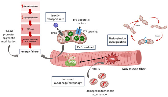 Many studies have evidenced that defective mitochondria contribute to the pathophysiology of DMD. Mitochondria structure is altered even before the onset of muscle fiber damage and metabolic defects, lowered mitochondrial potential, and promoting excessive mtROS production [52]. In both DMD patients and animal models (mice and worms), autophagy and mitophagy appear to be significantly compromised, leading to the accumulation of damaged mitochondria that could negatively impact the muscle [53,54,55,56]. Interestingly, the inhibition of autophagy is evident with the progression of the disease, concomitant with the fibrotic phase and the exhaustion of stem-cell-mediated regeneration. Conversely, autophagy is active in the early regenerative stage of DMD [56]. This last point is debated and other evidence indicates that autophagy flux is impaired in both young and old mdx mice, suggesting that especially in aged dystrophic muscle, lysosomal insufficiency could contribute to failing autophagic flux [57].