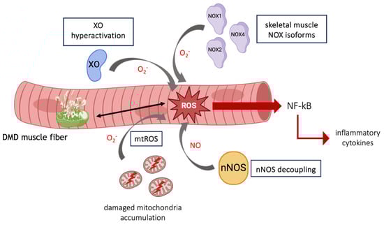 The suspected sources of free radicals in dystrophin deficiency include damaged mitochondria, the activity of nicotinamide adenine dinucleotide phosphate (NADPH) oxidases (NOXs) and xanthine oxidase (XO), expressed either in inflammatory cells or in muscle fibers, and the decoupling of neuronal nitric oxide synthase (nNOS) from the sarcolemma [79,80,81,82] (Figure 3); therefore, drugs acting at these levels have been tested in the treatment of DMD. The mitochondrial electron transport chain and NOXs are currently considered the predominant source of ROS in muscular dystrophy [83,84].