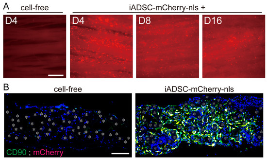 In our experimental system, transplanted ADSCs remained resident in scaffolds for a month, allowing us to study the interplay between donor ADSCs and recipient cells in vivo, in contrast to a previous report where syngeneic MSCs had a short lifespan (7 days) in mice [