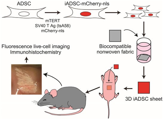 14]. All procedures were performed in a laminar flow cabinet. A 5–10 mm transverse incision was made in the skin on the mouse back, and the subcutaneous tissue was bluntly dissected for subcutaneous transplantation of 3D iADSC sheets. One 3D iADSC sheet was introduced into the subcutaneous space of a neonate. The incised skin was sutured, and the incision dressed with adhesive plasters to prevent the mother mice from removing sutures while nursing for several days. The entire operation for one neonate, from anesthesia to dressing, was performed within 10 min. Postoperated mice were kept warm until waking and then returned to their mother mice.