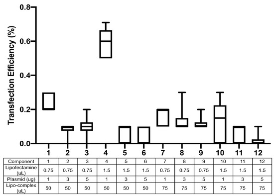 Optimization of transfection in U937 cells. Different combinations of the transfection agent (lipofectamine), transfection plasmid and the lipo-complex were tested, and the efficiency of transfection was monitored through the GFP expression in U937 cells. The x-axis indicates each of the 12 conditions tested as noted in the table below the plot. Transfection efficiency (% cells transfected) is quantified on the y-axis. All experiments were conducted in triplicate and further duplicated on two different days.