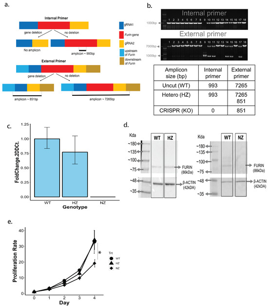Identification of CRISPR-mediated U937 clones hemizygous (HZ) and nullizygous (NZ) for FURIN, and detection of FURIN transcript and protein. (a) Schematic of the internal primer (internal to the FURIN coding region) and external primers (external to and flanking the FURIN gene) used to test for the presence of CRISPR-mediated FURIN gene deletion via PCR. The various segments around the FURIN gene are color-coded and explained through the legend on the right. For both internal and external PCR primers, the expected amplicon length in the presence or absence of FURIN gene deletion are indicated through the black bars. (b) Results from PCR analysis of a selection of 18 CRISPR-edited U937 clones. The top panel depicts PCR amplicons generated by the internal primer, and the bottom panel depicts amplicons generated by the external primer. Molecular weight markers are shown in lane 1 of each electropherogram. Lane 9 in both images correspond to a homozygous FURIN deletion (NZ), whereas lanes 10, 11, 14, 15 and 17 refer to potential heterozygotes with one copy of the FURIN gene intact (HZ). Other lanes refer to clones with a wild-type FURIN status. The expected amplicon sizes for wild-type (WT), hemizygous (HZ) and nullizygous (NZ) FURIN statuses are shown in the table below. (c) Quantification of FURIN messenger RNA in WT, HZ and NZ cell clones via qPCR. Results are depicted as fold changes with respect to the clone containing wild-type FURIN, and were calculated using the delta-delta Ct method. (d) Western blot analysis of FURIN protein expression in WT, HZ and NZ clones. For each blot, the molecular weight markers are indicated on the leftmost lane. The left panel shows the FURIN expression in the WT and HZ clones, along with that of beta-ACTIN as a loading control. The right panel quantifies the FURIN expression in the WT and NZ clones along with beta-ACTIN controls (no FURIN expression was observed in the NZ sample). (e) Quantification of cell proliferation in WT (circle), HZ (triangle) and NZ (diamond) U937 clones over 96 h post seeding. Statistical significance of differences in cell proliferation was ascertained by conducting t-tests at each time-point (*, p < 0.05).