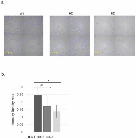 A comparison of the abilities of the WT, HZ and NZ FURIN clones to accumulate lipid was performed by first differentiating the clones into macrophages and then exposing them to fluorescently labeled oxidized LDL particles for 4–8 h. The results suggest a reduced, but not statistically significant, lipid accumulation capacity in the HZ clone compared to that of the WT (p > 0.05). However, a significantly reduced lipid accumulation was observed in the NZ clone (p < 0.05), suggesting a potential role of FURIN in regulating lipid accumulation in macrophages (Figure 5a,b).