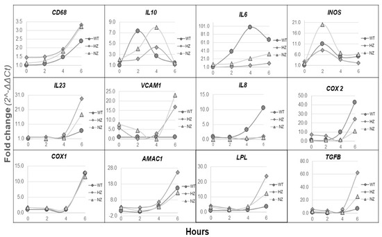 Effects of the FURIN gene status on the inflammation-related gene expression. WT (gray circle), HZ (gray diamond) and NZ (gray triangle) U937 monocyte clones were assayed for the expressions of selected inflammation-related genes following LPS-stimulation, via qPCR. All results are reported as the fold change in gene expression with respect to the basal 0 h expression. Experiments were conducted in triplicate, and fold changes in gene expressions were calculated using the delta-delta Ct method. HZ, heterozygous; NZ, homozygous knockout (nullizygous).