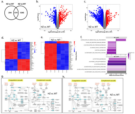 Effect of FURIN the gene status on the whole-genome transcriptome expression in U937 cells. (a) Unique and overlapping differentially expressed genes (absolute fold-change ≥ 2, adj.p-value ≤ 0.01) in the HZ and NZ clones compared to in WT. (b,c) Volcano plots of log2 fold-change (x-axis) vs. -log10 p-value in HZ vs. WT and NZ vs. WT comparisons, respectively. Genes with >=2-fold upregulation are colored red, genes with <=2-fold downregulation are colored blue, and other genes are shown in gray. (d,e) Heatmaps of the top 40 most differentially expressed genes (sorted by adjusted p-value) in HZ vs. WT and NZ vs. WT comparisons, respectively. (f) Bar chart depicting the top up- and down-regulated KEGG and Gene Ontology Biological Process pathways identified via gene set enrichment analysis (adjusted p-value ≤ 0.2) of HZ vs. WT and NZ vs. WT. The pathway enrichment scores are plotted on the x-axis, and pathway names are listed on the y-axis. Each pathway name is preceded by a (K) or (G) to indicate the source of the pathway as KEGG or GOBP, respectively. Bars are color-coded according to the −log10 of the adjusted p-value of the pathway enrichment. (g,h) KEGG pathway maps for the ‘Complement and Coagulation Cascades’ pathway in HZ vs. WT and NZ vs. WT, respectively, with the genes contributing to pathway enrichment highlighted in blue.