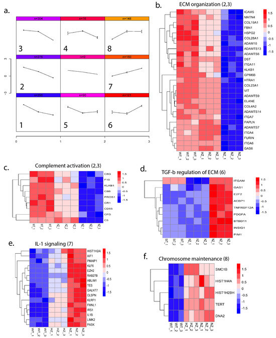 Patterns of gene expression as a function of the FURIN gene status. (a) Gene expression profiles across WT, HZ and NZ U937 cells were clustered using self-organizing maps (SOMs), depicting eight distinct patterns. The number of genes for each pattern are listed at the top of each subplot. (b–f) Pathway enrichment analysis of gene sets in selected clusters. Each heatmap plots the expression of cluster-specific genes (rows) across replicate samples (columns). Expression values are row-normalized and color-coded from low (blue) to high (red) expression. The pathway name is indicated at the top of each heatmap, and the SOM cluster number is indicated in parentheses.