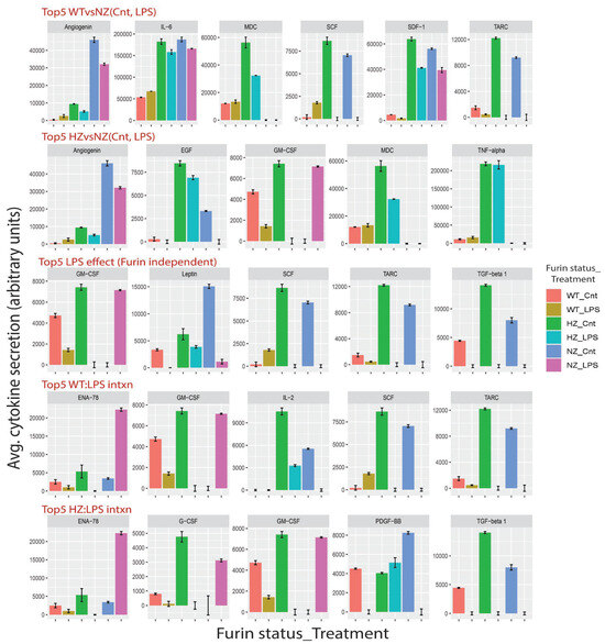 Proteomics analysis of the effects of the FURIN gene status on cytokine secretion under basal and LPS-stimulated conditions. Cytokine secretion was assessed on antibody arrays and quantified after normalization via background subtraction and scaling. The plot is divided into five panels representing key cytokine secretion patterns observed in response to LPS stimulation and FURIN gene status (WT, HZ, NZ): Top5 WTvsNZ (Cnt, LPS), top five cytokines showing significant changes in secretion between WT and NZ samples under both basal and LPS stimulation; Top5 HZvsNZ (Cnt, LPS), cytokines showing significant secretion differences between HZ and NZ clones under both basal and LPS stimulation; Top5 LPS effect (Furin independent), top five cytokines showing significant secretion effects upon LPS stimulation, regardless of the FURIN gene status; Top5 WT:LPS intxn, top five cytokines showing significant interaction effects between WT and LPS stimulation; Top5 HZ:LPS intxn, top five cytokines with significant interaction effects between HZ and LPS stimulation. Cytokine names are indicated at the top of each subplot. Bars are color-coded by a combined identifier containing the FURIN gene status and LPS stimulation status. The x-axis lists the combined identifiers, and the y-axis indicates the normalized cytokine secretion levels (results are averaged over duplicates).