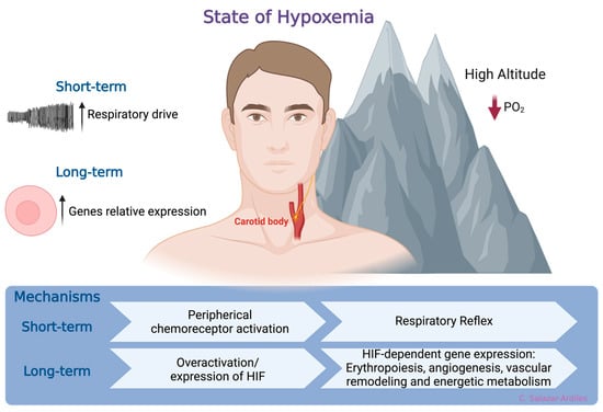 States of hypoxemia. When oxygen levels decrease, two distinct, time-related phenomena are triggered. In the short-term, a respiratory reflex is activated through peripheral chemoreceptors, specifically the carotid body. This reflex initiates a compensatory mechanism aimed at enhancing the availability and delivery of oxygen at the tissue level. Following more prolonged exposure to hypoxia, a molecular response is triggered. This response involves the hypoxia-inducible factor (HIF), which, in turn, induces gene expression related to processes such as erythropoiesis, angiogenesis, vascular remodeling, and energetic metabolism. Created with BioRender.com.