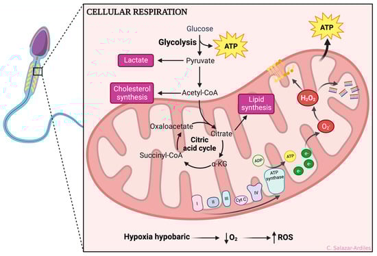 According to the WHO Manual for Analysis of Human Semen and Sperm Interaction with Cervical Mucus, sperm motility is one of the essential parameters, given that the motility allows sperm to migrate from the insemination site to the fertilization area [95]. Of note, it has been shown that oxidative stress also promotes the deterioration of sperm motility [71,79,105]. Indeed, low synthesis of ATP is proposed as one of the essential mechanisms related to the loss of sperm motility during HH due to a metabolic shift [106]. Luo et al. observed that, in human sperm, HH promotes an increment of mitochondrial DNA copies, which has been proposed as a compensation mechanism for low ATP production [107]. Another study shows that a high degree of oxidative stress in the semen causes a decreased activity in the enzyme glucose-6-phosphate dehydrogenase, contributing to reduced sperm motility due to a metabolic deficiency [108].