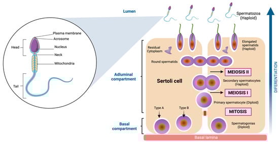 The inner of the seminiferous tubules present a highly organized preestablished architecture, conformed by seminiferous epithelium, which is structured for two different types of cells. The first of these are Sertoli cells (SC), irregular columnar somatic cells attached to the basal lamina. They have a large nucleus with even chromatin distribution, surrounding and supporting germ cells. Tight junctions form the blood-testis barrier, dividing the seminiferous epithelium into basal and adluminal compartments [51]. The second are Germ cells. These cells comprise a family whose fundamental purpose is transforming into spermatozoa to transmit genetic information across generations. Morphological studies have allowed us to characterize the shape and structure of the germ cells [52,53]. Indeed, six types of germ cells have been identified in the adult testis, which differentiate into spermatozoa [54]. These include Spermatogonia, diploid, undifferentiated cells adjacent to the basement membrane, characterized by a dense nucleus housing a prominent nucleolus. Their extensive cytoplasm contains ribosomes, vesicular endoplasmic reticulum, and clustered mitochondria [52,55]. Primary Spermatocytes: Engaging in meiosis without direct basal lamina contact, these cells possess a well-developed Golgi apparatus and rough endoplasmic reticulum. Their nucleus assumes a spherical shape with filamentous chromatin, a characteristic of prophase I [56]. Secondary Spermatocytes: Haploid, ovoid cells with a nucleus containing prominent chromatin clumps. The cytoplasm is rich in rough endoplasmic reticulum [57]. Round Spermatids: These haploid cells exhibit a polygonal or spherical morphology, approximately 6 μm in diameter. Their small nucleus contains uniformly distributed chromatin. They undergo a transformative process to mature as spermatozoa [58]. Elongated spermatids: Elongated spermatids are highly polarized cells with a head that contains the genetic materials in highly condensed chromosomes on one end and a long tail constituted by actin- and microtubule (MT) -based cytoskeletal elements [59]. Spermatozoa: These highly diverse cells are recognized for mobility from the insemination site to fertilization. Variations in head shape and flagellum length are evident among different species. The acrosome, derived from the Golgi complex, stores enzymes essential for penetrating egg coats. The nucleus, occupying a significant portion of the head volume, is the repository for genetic information the male progenitor contributes. The flagellum is the mobile apparatus, segmented into the neck, middle piece, principal piece, and endpiece [60,61] (see Figure 3).