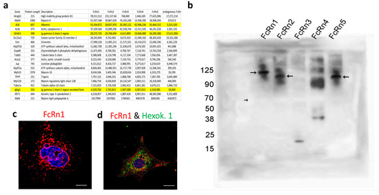 The isolation of FcRn variant specific vesicles and splice variant interaction with albumin. FcRn-specific vesicles were isolated using anti-FLAG tag or anti-mouse FcRn antibodies and protein G conjugated with magnetic beads. The isolated vesicles were analyzed by mass spectrometry, and the 20 proteins with the highest intensity are shown and albumin and IgG are highlighted (a). (b) FcRn splice variant interaction with mouse albumin was determined by Western blot. Mouse serum albumin (50 μg) was incubated with an equal concentration of purified recombinant FcRn1, 2, 3, 4 or 5 overnight at 37 °C in a PBS buffer at pH 5.5. The solution was resolved using an SDS-PAGE gel and Western blot. The membrane was probed with an anti-FLAG tag antibody and an anti-species HRP-conjugated secondary antibody. Large arrows indicate the interaction of FcRn1, 2 and 5 with albumin. The small arrow indicates the albumin as a negative band. A representative image of FcRn nuclear envelope location (c). A representative image of FcRn colocalization with the mitochondrial marker hexokinase 1 (d). The scale bar represents 10 μm.