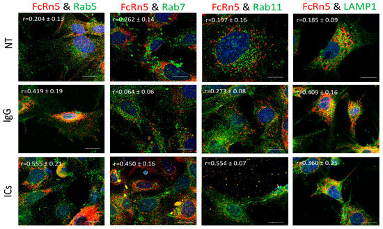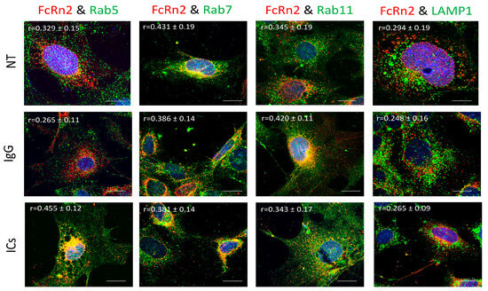 Overexpression of FcRn2 in FcRn-KO podocytes and its interaction with Rab5, 7, 11, and LAMP1 vesicles in the presence of media alone (NT), monomeric IgG, or immune complexes (ICs). FcRn-KO podocytes were infected with the lentivirus vector carrying FcRn2 and the cells were assayed after 72 h. Monomeric IgG and immune complexes were added to the cells for 2 h and incubated at 37 °C and 5% CO2. Staining and imaging are as in Figure 2. The scale bar represents 10 μm. The (r) values represent colocalization intensity plus/minus standard deviation.