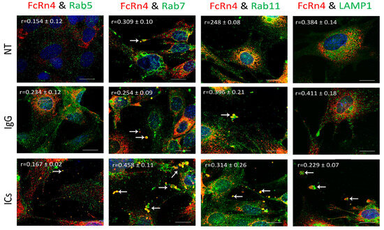 FcRn3 is the splice variant missing exons 3 and 4. As Figure 5 shows, FcRn3 vesicles had a minimal interaction with Rab5 vesicles across the various treatments: NT (r = 0.225 ± 0.11), IgG (r = 0.102 ± 0.06) and ICs (r = 0.069 ± 0.04). There was a noticeable interaction between FcRn3 and Rab7 vesicles in the NT group (r = 0.361 ± 0.13) and in the presence of ICs (r = 0.380 ± 0.18). A limited interaction was observed in the presence of IgG (r = 0.217 ± 0.12). The interaction between FcRn3 and Rab11 vesicles was minimal under NT (r = 0.175 ± 0.10), increased in the presence of IgG (r = 0.392 ± 0.16), and was limited in the presence of ICs (r = 0.262 ± 0.16), with many vesicles observed outside the cells (white arrows). There was very limited colocalization between FcRn3 vesicles and lysosomes: NT (r = 0.297 ± 0.04), IgG (r = 0.212 ± 0.11), and ICs (r = 0.148 ± 0.11).