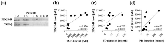Correlation between the amount of PDGF-B and TGF-ß in the peritoneal dialysis effluent (PDE) and the duration of peritoneal dialysis (PD) in children. The amount of PDGF-B and TGF-ß in the lyophilized PDE samples (n = 9, patients A–I) was measured by Western blot analysis (a). Correlation between PDGF-B and TGF-ß levels (b), PDGF-B level, and PD duration (c), and TGF-ß level and PD duration (d) was determined by Spearman coefficients (r). Dots represent individual values. AU: arbitrary units.