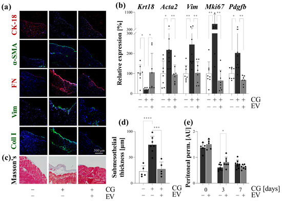 To investigate the in vivo effect of PDE-EVs, the most commonly used CG-induced mouse model of peritoneal fibrosis was adopted [21]. The intraperitoneally administrated DiI-labeled PDE-EVs resulted in a strong fluorescent signal in the parietal and visceral peritoneum of CG-treated mice, suggesting the significant peritoneal uptake of PDE-EVs (Figure 7b). The peritoneum of the control mice was CK-18 immunopositive, but negative for mesenchymal or fibrosis markers, including α-SMA, vimentin, fibronectin, and Col 1-α (Figure 8a). CG treatment increased the peritoneal mRNA expression of Mki67, Pdgfb, Acta2, and Vim, but decreased that of the Krt18 expression compared to the peritoneum of control mice (Figure 8b). In accordance, the peritoneum of CG-treated mice was positive for the mesenchymal and fibrosis markers, including the α-SMA, vimentin, fibronectin, and COL1-α, and it was negative for the CK-18 epithelial marker (Figure 8a). These changes suggest that the peritoneal mesothelial layer of the CG-treated mice that underwent MMT PDE-EV treatment increased the mRNA expression of Krt18 and decreased that of MKi67, Pdgfb, Acta2, and Vim (Figure 8b). Accordingly, the PDE-EV treatment of the mice almost completely inhibited the CG-induced immunohistological changes of the mesothelial layer, including its α-SMA, vimentin, and COL1-α positivity (Figure 8a). These molecular biological changes were in accordance with the histological changes of the peritoneal submesothelial zone (Figure 8c). Indeed, while the mean thickness of the submesothelial zone increased from 22.7 to 74.3 µm in response to CG treatment, it was almost completely normalized in response to the PDE-EV treatment (Figure 8d). Finally, we monitored the ultrafiltration capacity of the peritoneal membrane using tetramethylrhodamine isothiocyanate (TRITC)-labeled 70 kDa dextran and fluorescein-isothiocyanate-labeled 4 kDa dextrane. We found that, while CG treatment decreased the peritoneal ultrafiltration due to the submesothelial thickening [22] (Figure 7a and Figure 8e), the PDE-EV treatment slightly improved the peritoneal transport function on the third day of CG treatment (Figure 8e).