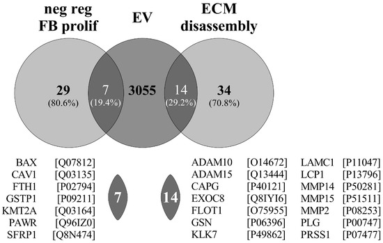 Gene Ontology (GO) Enrichment Analysis (powered by PANTHER) showed that seven of the PDE-EV proteins—based on the previous proteomic data of Pearson and coworkers [14]—were enriched in the GO term of the “negative regulation of fibroblast proliferation” (GO:0048147—consisting of 29 proteins) and 14 in the “ECM disassembly” (GO:0022617—consisting of 34 proteins) (Figure 9).