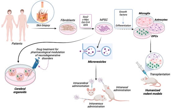 Human induced pluripotent stem cells (hiPSCs) derived from patient’s somatic cells, particularly from human fibroblasts obtained via skin biopsy, can be differentiated into a variety of cell types, including astrocytes, microglia and oligodendrocyte precursor cells (OPCs). hiPSCs have multiple potential applications in preclinical research, including generation of brain organoids and humanized mouse models by cell transplantation, and can be used as drugs themselves by directly administering iPSC-derived microvesicles to rodent models of disease. See text for details. Created with BioRender.com (accessed on 18 March 2024).