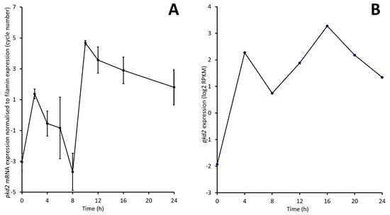 Semiquantitative reverse transcription PCR was used to quantitate expression levels of pkd2. RNA was extracted from 107 vegetative cells or cells harvested from water agar every 2 h over 24 h for the developmental time course using TRIzol® (Invitrogen) and treated with RQ1 DNase (Promega, Madison, WI, USA) according to the manufacturer’s instructions. The iScript™ One-Step RT-PCR Kit with SYBR® Green (BioRad, Hercules, CA, USA) was used for amplicon detection using the primers outlined in Section 2.4. An RNA template of 50–100 ng was added to the total reaction mixture of 50 μL; cDNA synthesis was performed at 50 °C for 10 min, and the PCR cycling and detection used 45 cycles of denaturation at 95 °C for 30 s, annealing at 58 °C for 30 s and extension and data collection at 72 °C. Expression was normalized against the abpC mRNA levels to adjust for loading and then measured relative to AX2 controls.
