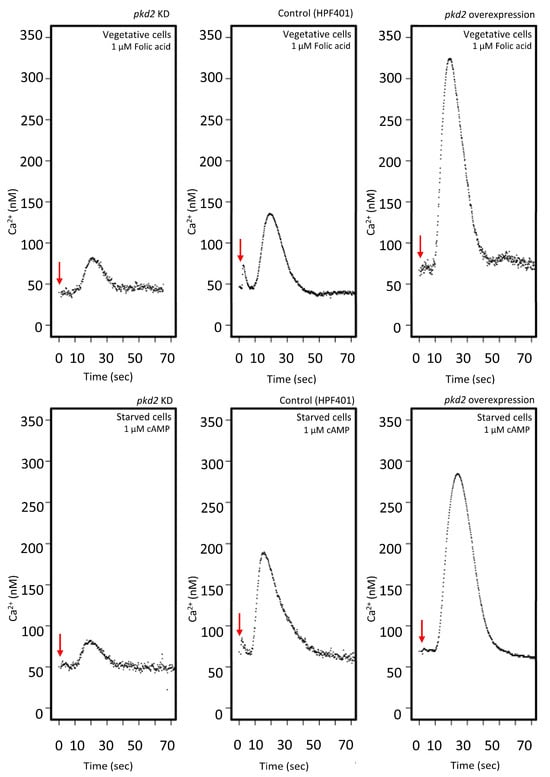 Cytoplasmic Ca2+ responses are larger in Polycystin-2-overexpressing strains and smaller in knockdown strains. Representative calcium responses in three strains, pkd2 KD strain HPF644 (copy number 13), control (HPF401) and pkd2 overexpression strain HPF839 (copy number 311). The top panel illustrates calcium reactions in vegetative cells when stimulated by folic acid, while the bottom panel depicts calcium responses in starved cells (7 h) stimulated with cAMP. Recordings commenced at 0 s, and the stimulus was administered within 1 s (highlighted by red arrows). The minor peak preceding the chemoattractant-induced calcium response results from the mechanical force of the stimulus injection and does not influence the magnitude of the chemoattractant response.