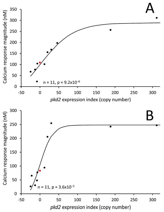 Calcium response magnitudes correlate with plasmid copy number. Cytosolic response magnitudes (Ca2+ nM) in strains with different copy numbers for pkd2 overexpression or KD constructs. Each point is the mean of 2–5 independent recordings for an individual strain. (A) Starved cells were stimulated with 1 µM cAMP. (B) Vegetative cells were stimulated with 1 µM folic acid, measured from real-time recordings. Response magnitudes positively correlate with the pkd2 expression index. Control strain HPF401 is indicated in red. Regression lines were fitted to a sigmoidal (hyperbolic tangent) function. The regressions were highly significant with the indicated probabilities (F test).
