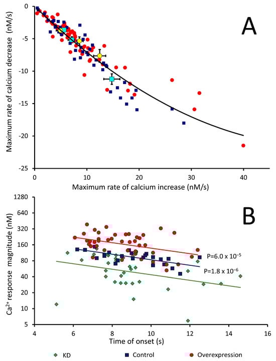Kinetics of chemotactic Ca2+ responses in Polycystin-2 strains. (A) Negative relationship between maximum rise and fall rates in control, pkd2-overexpressing and knockdown (KD) strains. Each point represents an individual experiment. Blue squares indicate responses to 1 µM cAMP and red circles indicate responses to 1 µM folic acid. Aqua squares are means for cAMP responses and yellow circles are means for folic acid responses from left to right, KD, control and overexpression strains. Rise and fall rates at all stages in the responses were calculated from the Ca2+ concentrations at successive time points and the maximum rates of Ca2+ increase and decrease were then determined graphically using features of the R statistics and graphics package. Multiple regression analysis showed that neither the attractant (folate or cAMP) nor the strain type (overexpression or KD or control) made a difference in the regression relationship (p > 0.05). (B) Relationship between the response onset time and magnitude. The relationship is log-linear and negative for pkd2 overexpression, KD and control strains; however, each set of strains falls on a different line. Multiple regression analysis showed that the intercepts (significance probabilities shown) but not the slopes (p > 0.05) differed significantly from the line for the control strain.