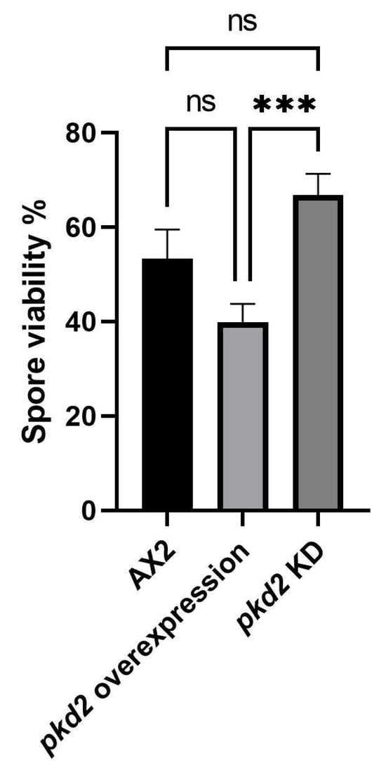 Polycystin-2 affects spore viability. Spores from three Polycystin-2 KD strains and three overexpression strains were harvested from fruiting bodies and heat activated. A known number of spores were then plated on lawns of Enterobacter and allowed to germinate. The viability was calculated by determining the number of germinated spores as a percentage of the number of plated spores. The means are calculated from pooled data from all strains within each group over three individual experiments. Error bars are standard errors of the mean. There was a significant difference in the viability between the KD strains and overexpression strains, KD n = 9, overexpression n = 9, control n = 3 (*** p = 0.0003, ns = not significant, Unpaired t-test).
