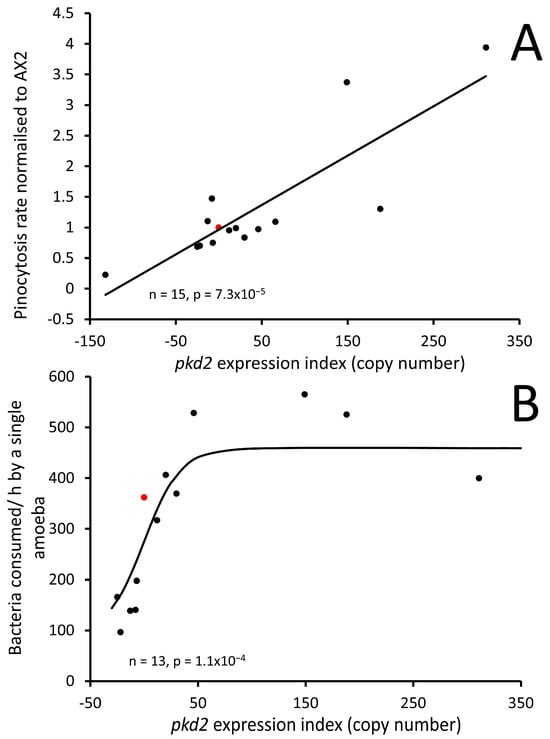 Polycystin-2 positively regulates pinocytosis and phagocytosis. (A) Pinocytosis was positively regulated by Polycystin-2. The consumption rate of FITC dextran-HL5 medium was measured in AX2 (red marker), Polycystin-2 KD and overexpression strains. The regression line was fitted by least squares to a linear function, and was significant, probability indicated (F test). (B) Phagocytosis was measured as consumption of E. coli expressing the red fluorescent protein DsRed. Phagocytosis and pinocytosis rates increased as Polycystin-2 expression increased, AX2 indicated in red. The regression line was fitted to a sigmoidal (hyperbolic tangent) function and was highly significant, probability indicated (F test).