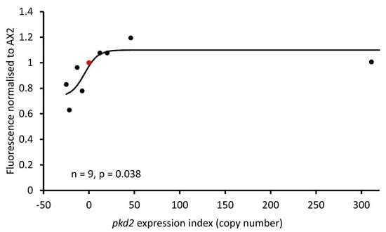 Dictyostelium strains were generated by transforming them to express constructs that either suppress mRNA expression through antisense mRNA inhibition- knockdown (KD) strains or enhance mRNA expression–overexpression strains. Plasmid integration takes place randomly in the genome through a process known as recombination and rolling circle replication. The outcome of this process produces individual strains with varying copy numbers of integrated plasmids, resulting in differing levels of mRNA expression [50]. To determine the number of copies integrated into the genome of each transformant, quantitative real-time PCR was used, and semiquantitative real-time RT-PCR was used to determine the subsequent mRNA expression levels. A regression analysis was then carried out to determine any relationship. As anticipated, antisense inhibition led to a reduction in mRNA expression, overexpression increased expression and there was a significant correlation between copy number and mRNA expression (Figure 2). This allowed us to create a pkd2 expression index for phenotypic analysis, following the previously published convention of using negative values (the antisense inhibition construct copy number) and positive values (the overexpression construct copy number) [38]. This allowed gene dose–response relationships to be determined and revealed correlations between the construct copy number and the severity of phenotypes.