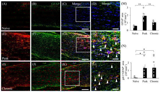 - Itabashi, T.; Arima, Y.; Kamimura, D.; Higuchi, K.; Bando, Y.; Takahashi-Iwanaga, H.; Murakami, M.; Watanabe, M.; Iwanaga, T.; Nio-Kobayashi, J. Cell- and stage-specific localization of galectin-3, a β-galactoside-binding lectin, in a mouse model of experimental autoimmune encephalomyelitis. Neurochem. Int. 2018, 118, 176–184. [Google Scholar] [CrossRef] [PubMed]