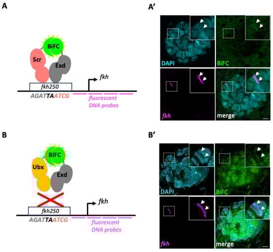 We next wanted to assess whether we could quantify BiFC signals specifically on the fkh locus by conducting DNA–FISH conditions (Figure 2A,B). To this end, we designed fluorescent oligonucleotides spanning 12 kb upstream and downstream of the fkh gene (see Section 2) and performed FISH staining on BiFC-positive salivary gland nuclei. Although the FISH signals were clearly observable, we could not detect BiFC signals for Scr/Exd complexes (neither in the whole nucleus, nor on the fkh locus: Figure 2A’ and Figure S3). The BiFC signals were also extremely weak with Ubx/Exd complexes, making any quantification difficult. A more defined pattern of BiFC signals (Figure S3), especially after deconvolution (Figure 2B’), could be observed in a few nuclei. In these rare nuclei, the fkh FISH signal was systematically localized in a zone with low or no BiFC (Figure 2B’), which is in accordance with previous work showing that Ubx/Exd complexes can neither bind the fkh250 enhancer in vitro, nor regulate its expression in vivo []. Altogether, these experiments reveal that the experimental conditions for FISH are detrimental for BiFC, underlining the need to use alternative approaches for conducting colocalization studies involving a genomic ROI.