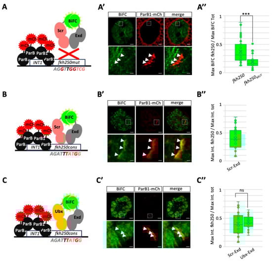 We first performed BiFC by expressing VC–Scr and VN–Exd in ParB1–mCherry/INT1–fkh250-positive salivary gland nuclei (Figure 3A). In contrast to the previous observation under the DNA–FISH conditions, the VC–Scr/VN–Exd BiFC signals were not affected. Quantification (see also Section 2) showed that the BiFC signals were significantly enriched with ParB1–mCherry, demonstrating preferential localization on the fkh250 enhancer when compared to other genomic loci in the salivary gland nuclei (Figure 3A’,A” and Figure S4).