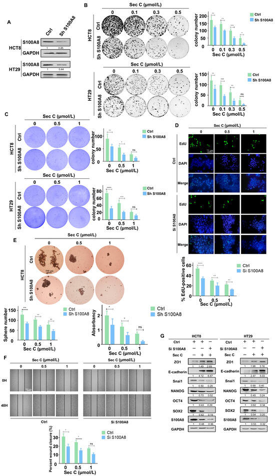 As for the self-renewal ability, when S100A8 was downregulated, the spheres were much smaller than those of the control, and the number decreased significantly. With the 0.5 μmol/L Sec C treatment on HCT8 cells, approximately 66% of the spheres of the control survived and approximately 58% were alive under 1 μmol/L Sec C when almost no normal spheres could be seen in the wells of view. Concurrently, the HT29 cells showed a similar repression status, as shown in the Supplementary Materials (Figure 5E and Figure S4B). In addition, the migration capacity was also affected by the shortage of S100A8. Almost a 62% obstruction was detected under 1 μmol/L Sec C compared with the control group for HCT8 cells. Along with HT29 cells, it was obvious that Sec C displayed a stronger effect on the movement of tumor cells after S100A8 was downregulated (Figure 5F and Figure S4C). At the same time, Western blotting showed us that knocked-down S100A8 changed the expression of EMT and stemness markers after Sec C treatment. This confirmed that the loss of S100A8 helped Sec C to deprive tumor cells of stemness traits (Figure 5G).