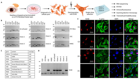 Selection of immortalized human lacrimal gland cells. (A) Cartoon illustrating the workflow from the lacrimal gland to the single clones. The figure was partly created with BioRender.com. (B) Agarose gels with the amplification products of RT-PCR against marker genes tested in the lacrimal gland cell pool (LG cell pool), single clones (clone 1, 3, 4, 5 and 6), a murine 3T3 fibroblast line (3T3 fibro), human corneal epithelial cells (CEC) and human mesenchymal stem cells (hMSC). (C) List of the genes tested in (B) with gene names, names of the respective protein product and the expected amplicon size. (D) Agarose gel with the amplification product of the inserted SV40 gene. (E) Immunofluorescence image of clones 1 (C1), 3 (C3), 5 (C5) and 6 (C6) stained against SV40 (red), F-actin (green) and the nucleus (blue).