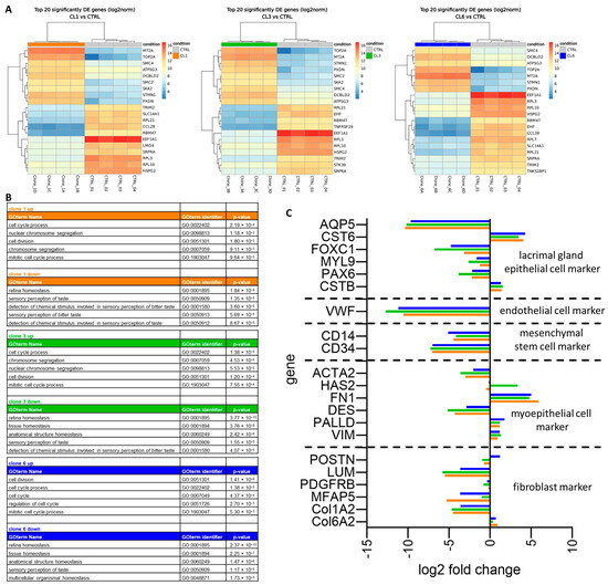 Total RNA sequencing of immortalized human lacrimal gland cells. (A) Differential expression analysis of the top 20 up- and downregulated genes for clone 1 (CL1), clone 3 (CL3) and clone 6 (CL6) compared to human lacrimal gland tissue of 4 donors (CTRL). (B) Top 5 up- and downregulated pathways using HumanMine’s (humanmine.org) GOterm gene analysis tool with GOterm identifier and p value. (C) Comparison of gene expression levels of marker genes for epithelial cells, endothelial cells, mesenchymal stem cells, myoepithelial cells and fibroblasts between clone 1 (orange), clone 3 (green), clone 6 (blue) and total lacrimal gland tissue. A list of marker genes can be found in Table S1.