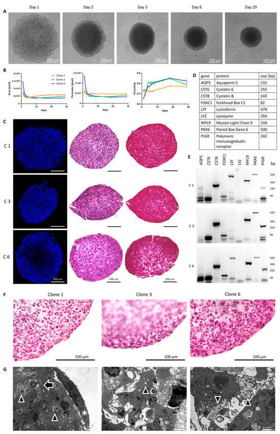 Analysis of the 3D spheroid cell culture model with immortalized lacrimal gland cells. (A) Transmitted light microscopy during the culture period of 3D-grown cells of clone 6. (B) Analysis of the area, perimeter and circularity of the spheroids of clones 1 (orange), 3 (green) and 6 (blue) over the course of a 29-day growth period. Data are means ± SEMs. [Day 1–8 n = 24, day 18 n = 9, and 29 n = 9]. (C) Image of 8-day-grown spheroids of clones 1 (C1), 3 (C3) and 6 (C6) with immunofluorescence staining against the nucleus (blue, left column), hematoxylin–eosin (middle column) and azan staining (right column). (D) List of the genes tested in (E) with gene names, names of the respective protein product and the expected amplicon size. (E) Agarose gels with the amplification products of RT-PCR against marker genes tested in clones 1, 3 and 6. (F) Magnified image of 8-day grown spheroids of clone 1, 3 and 6 with hematoxylin–eosin staining. (G) Transmission electron microscopy (TEM) image of 8-day grown spheroids with secretory granules (arrowheads), glycogen aggregation (arrow) and spheroid border cell (star).