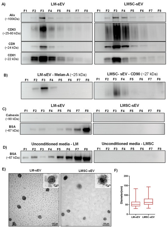 WB analysis was performed to characterize the different fractions by examining the presence of transmembrane proteins (CD9, CD63, CD81), the cytosolic EV protein Alix (PDCDIP), cell type-specific markers (CD90 for LMSC and Melan-A for LM), and the non-EV marker calnexin (CANX) as well as the co-isolated protein bovine serum albumin (BSA) [30]. WB analysis revealed that Alix was present in the majority of the fractions (at least as a faint band) but with a stronger band in F3 (Figure 2A). Similarly, CD9, CD63, and CD81 were present in fractions 2–4 but predominantly found in F3 (Figure 2A). The LMSC cell marker CD90 was present in fractions 2–4 of LMSC-sEV with the strongest signal in F3 (Figure 2B). Likewise, the LM-specific Melan-A appeared as a robust band in F3 of LM-sEVs (Figure 2B). Unconditioned media did not show any evidence of either EV- or cell-specific markers (Supplementary Files S2 and S3). The absence of the endoplasmic reticulum-resident protein CANX across all LMSC- and LM-sEV fractions (Figure 2C) but its presence in the cell lysates (Supplementary File S4), validated the effective isolation of sEVs without contamination by other cellular components [30]. WB analysis detected residual BSA, an abundant fetal bovine serum constituent, across LM-sEV fractions (Figure 2C) as well as in the unconditioned media control (Figure 2D), but not in the LMSC-sEV (Figure 2C,D). Since BSA signals were stronger in later eluting LM-sEV fractions 7 and 8 compared to earlier fractions 2–4, eliminating serum or switching to EV-depleted formulations could further enhance purity [34]. While standardized CNT-40 enables robust primary LM propagation in vitro [7,9,27,35], the effects of shifting this medium to a serum-free formulation on maintaining LM phenotype would need to be studied before follow-up studies on LM-sEV. Since these data confirmed enrichment of sEV in F3, this fraction was used in subsequent experiments.