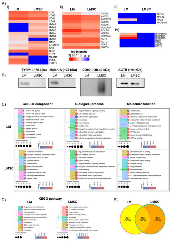 Proteomic characterization of small extracellular vesicles (sEV): (A) Heatmaps showing protein intensity profiles (based on iBAQ mean intensity, n = 5) of (i) plasma membrane and endosomal proteins, (ii) cytosolic proteins, (iii) apolipoproteins, and (iv) cellular contaminants across LMSC-sEV and LM-sEV samples. We employed relative quantification (iBAQ) to compare the abundance levels of known EV markers and potential contaminants (such as serum components or cytosolic proteins) within the sample. (B) Western blot validation confirming the presence of CD90 (LMSC), Melan-A and TYRP1 (LM), and β-actin in fraction 3 (F3) of respective sEV populations. Uncropped versions of the Western blot are shown in Supplementary File S7. (C,D) Top 10 enriched Gene Ontology (GO) terms for (C) Biological Process, Molecular Function, Cellular Component, and (D) KEGG pathways in LM-sEV and LMSC-sEVs. (E) Venn diagram showing the number of unique and shared proteins identified in LM-sEVs and LMSC-sEV.