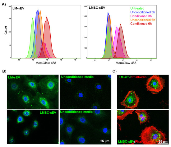A crucial aspect of any protocol designed for the isolation of Evs is the preservation of their functional properties. We verified that our isolation protocol did not disrupt the ability of Evs to be incorporated into recipient cells. To this end, we stained isolated Evs (F3) with a lipophilic fluorophore (Memglow). Following 3 or 6 h of incubation, a flow cytometric analysis revealed that LEPC treated with CM-derived sEVs (LMSC-sEVs or LM-sEVs) showed increased fluorescence intensity compared to LEPC treated with unconditioned media-derived sEVs as well as untreated control LEPC (Figure 6A). Furthermore, confocal microscopy revealed the presence of LM- or LMSC-sEV label signals in the perinuclear region of LEPC after 6 h (green, Figure 6B), strongly suggesting the internalization of sEV by LEPC [22]. LEPC were co-stained for F-actin with Phalloidin-TRITC (red, Figure 6C) for further confirmation. These data substantiate the potential role of sEVs in mediating communication between LEPC and LM or LMSC, suggesting that sEVs participate in paracrine signaling within the limbal stem cell niche. However, additional functional assays are required to prove the concept of sEV involvement in limbal niche homeostasis.