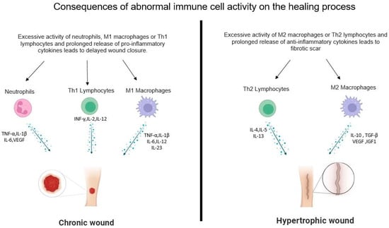 Cells of the innate and adaptive immune system cooperate with resident cells to provide integrated and sometimes redundant mechanisms to ensure proper wound repair. Dysregulation of immune cell activity at any stage of the process can lead to pathological conditions such as chronic wounds, hypertrophic wounds, or keloids. Chronic wounds, to date, represent an important cause of morbidity and mortality and are of serious clinical concern. In fact, a characteristic feature of chronic wounds is the presence of a chronic inflammatory process, due to a prolonged presence of pro-inflammatory cells in the wound. In chronic or hypertrophic wounds, there is dysregulation in the production of pro-inflammatory factors, such as TNF-α, IL-1, or IL-6, or anti-inflammatory factors, such as IL-4, IL-10, or TGF-β. These cytokines, therefore, represent important therapeutic targets, so strategies that modulate the immune system may be an innovative therapeutic approach for the treatment or prevention of chronic wounds. However, it must be considered that modulation of the immune system may have negative effects at sites other than the wound, or on other patient conditions, such as infections or allergies. Therefore, given the high complexity of the healing process, it is essential to conduct further studies to better understand the mechanisms underlying both normal and pathological healing.