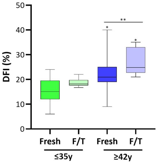 Effect of APA and cryopreservation on the sperm DNA fragmentation Index. Data obtained with the Halosperm kit are plotted as box–whisker plots, where boxes show the interquartile range with median values, and whiskers represent min and max confidence intervals. Number of analyzed samples: ≤35 years fresh and fresh and thawed (F/T) = 23; ≥42 years fresh and fresh and thawed (F/T) = 25. Significance * p < 0.05; ** p < 0.01.
