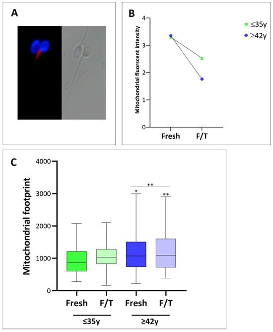 However, when we measured the signal intensity using Mitochondrial Network Analysis (MiNA), we observed that, while the fluorescence intensity in the fresh samples was comparable, there was a statistically significant reduction (p < 0.01) in the staining intensity of frozen/thawed sperm compared to the fresh samples. Notably, sperm mitochondria of men older than 42 years showed a 50% reduction in mean fluorescence intensity as compared to individuals younger than 35 (2.5 ± 1.3 and 1.8 ± 0.5, respectively; p < 0.001) (Figure 3B).