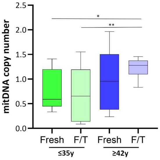 Consistent with this finding, we observed an increase in mtDNAcn in APA as compared to non-APA sperm (despite not being significant in our study cohort) and a significant impact on mtDNAcn specifically associated with cryopreservation in older men. Previous studies demonstrated a strong inverse association between sperm mtDNAcn and semen quality [23], as well as fertilization competence [50], indicating that mtDNAcn could be a useful biomarker of sperm quality [23,24]. Based on our results, we speculate that cryopreservation may induce mitochondrial fusion, which elicits mtDNA synthesis by facilitating ROS-triggering and recombination-mediated replication, thereby preventing the generation of mitochondria lacking DNA. Comprehensive investigations about the impact of mitochondrial damage on the functionality of cryopreserved sperm have been conducted in domestic animals. These studies point to oxidative stress as a key factor underlying the diminished survival and competence of cryopreserved sperm, posing a significant concern due to its correlation with reduced fertilization rates and in vitro embryo development [51]. In a recent study, supplementation of the freezing solution for human sperm with an antioxidant (myoinositol) attenuated the loss of both motility and vitality, as well as of mitochondrial activity in sperm from normozoospermic men [52].